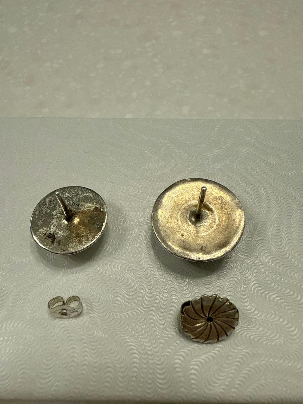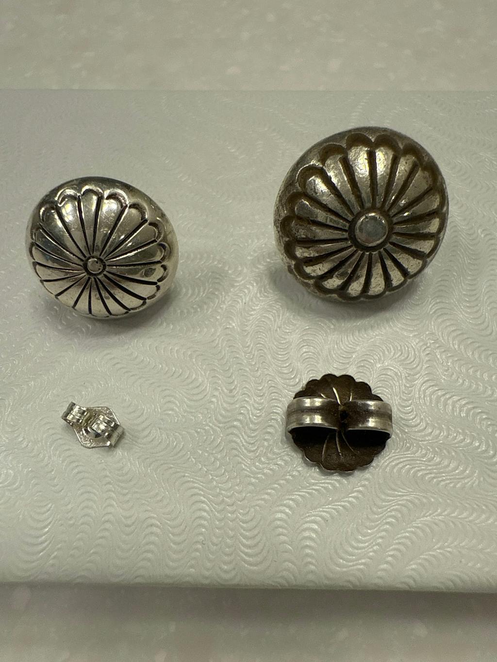 Marie Yazzie created these 5/8" sterling silver Navajo button earrings which are hand stamped and dopped.