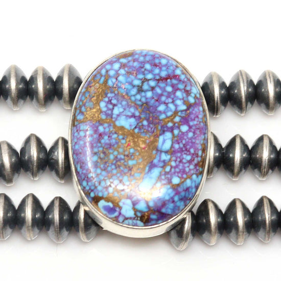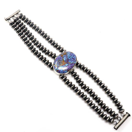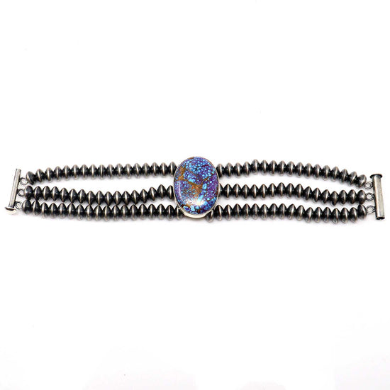 Link bracelet featuring 3 rows of 6mm sterling silver beads and a single Purple Mohave turquoise setting. The bracelet is 6.75" x 1" and weighs 55.2 grams.