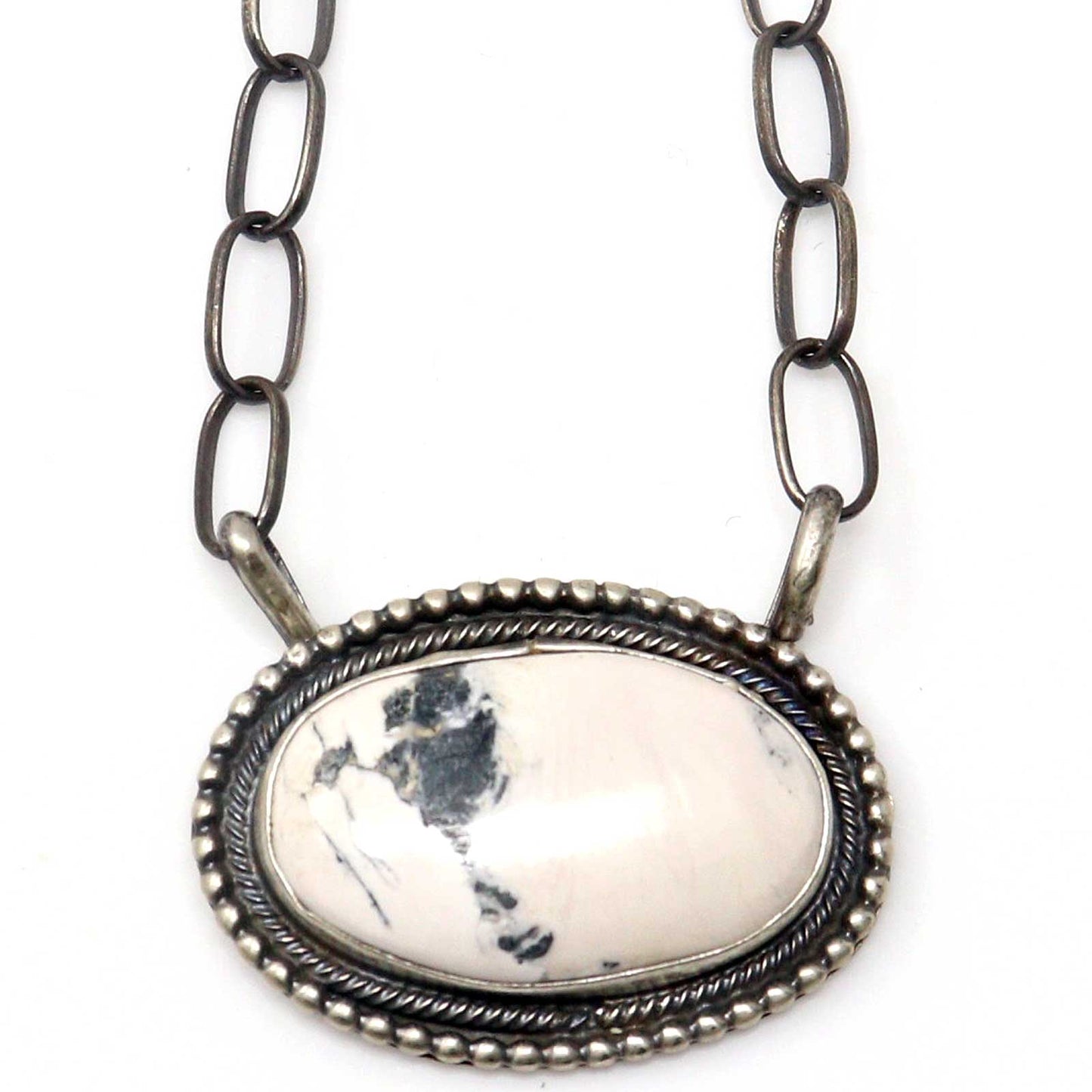 Sterling silver necklace featuring a White Buffalo pendant by Navajo artist Harold Smith. Necklace pendant is 1 1/4" wide , is 7/8" tall and the necklace in its entirety weighs approximately 17.4 grams. Chain is 18" long.