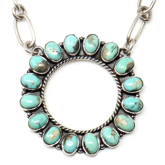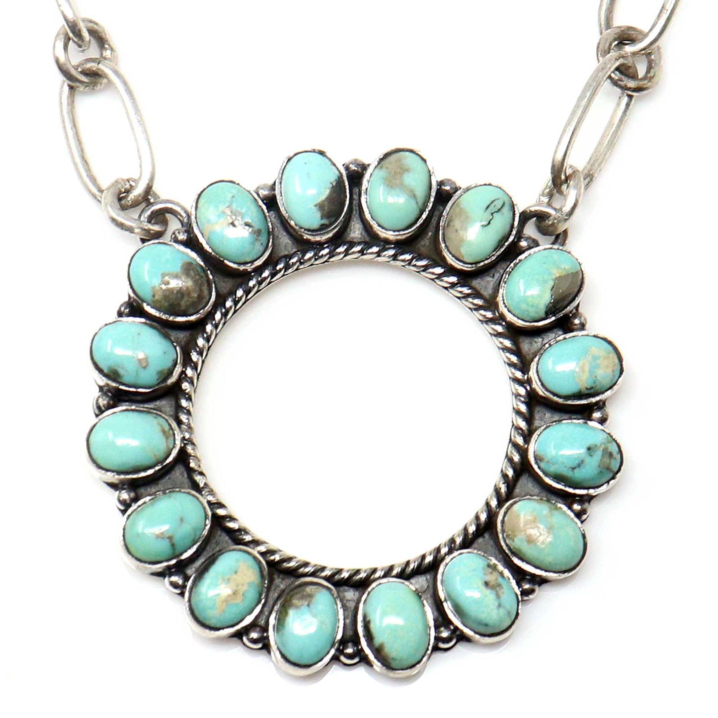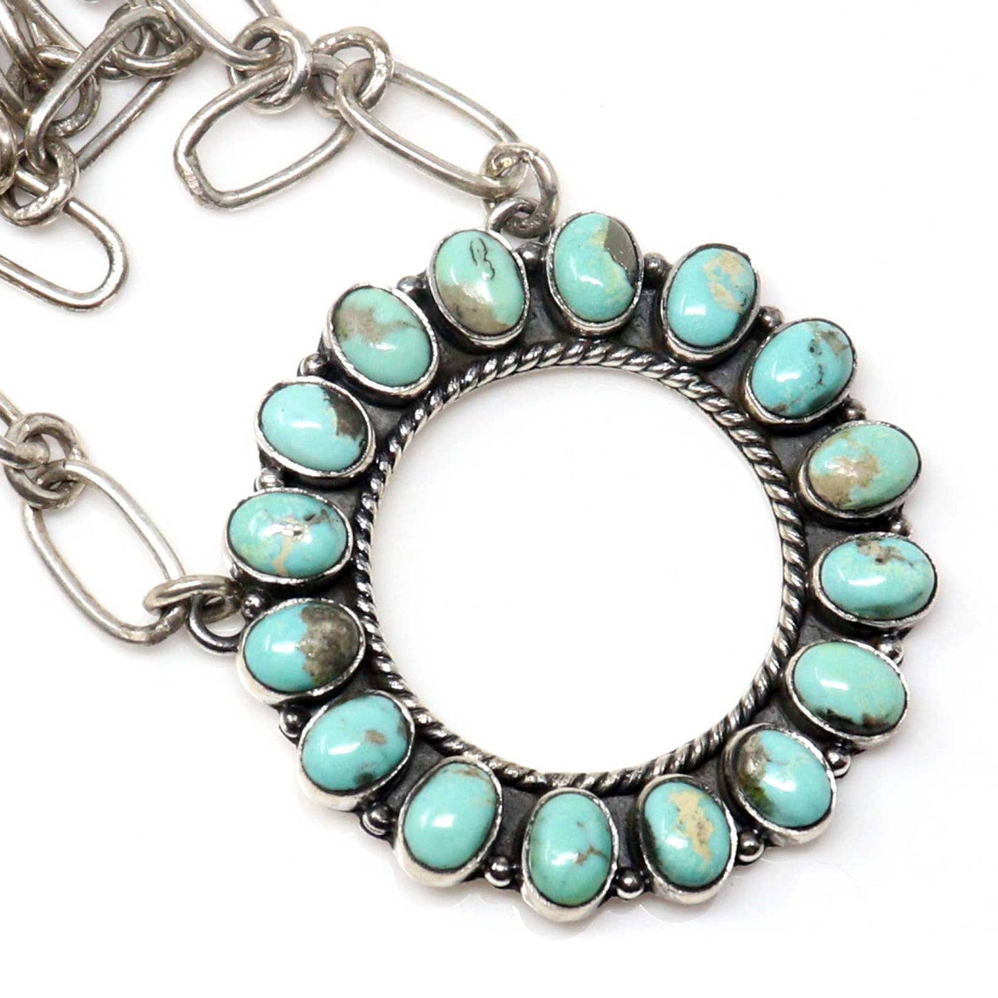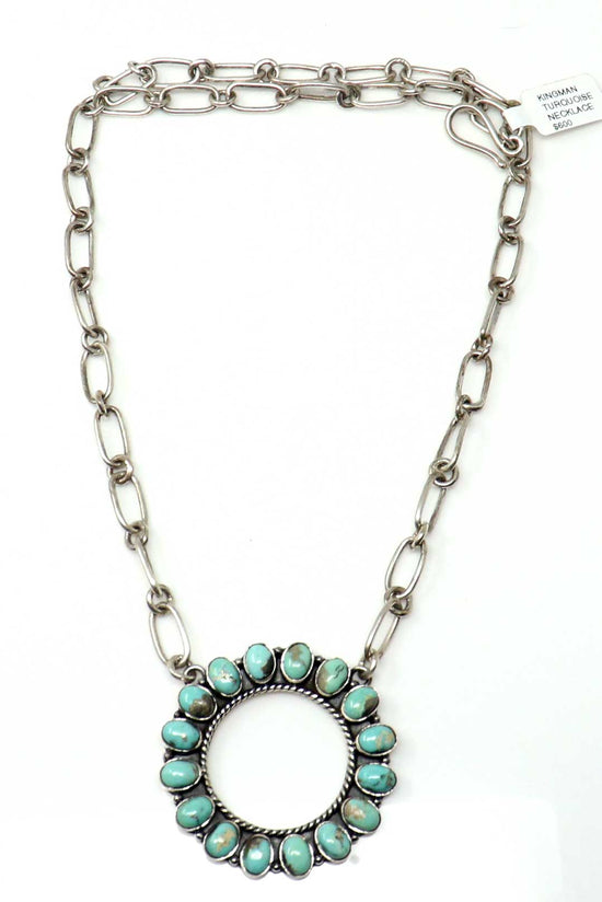Sterling silver eternity necklace featuring 16 individual Kingman turquoise settings suspended from a sterling silver chain. Pendant is 1 5/8" in diameter, has a hanging length of 21" and the necklace weighs 35.3 grams.