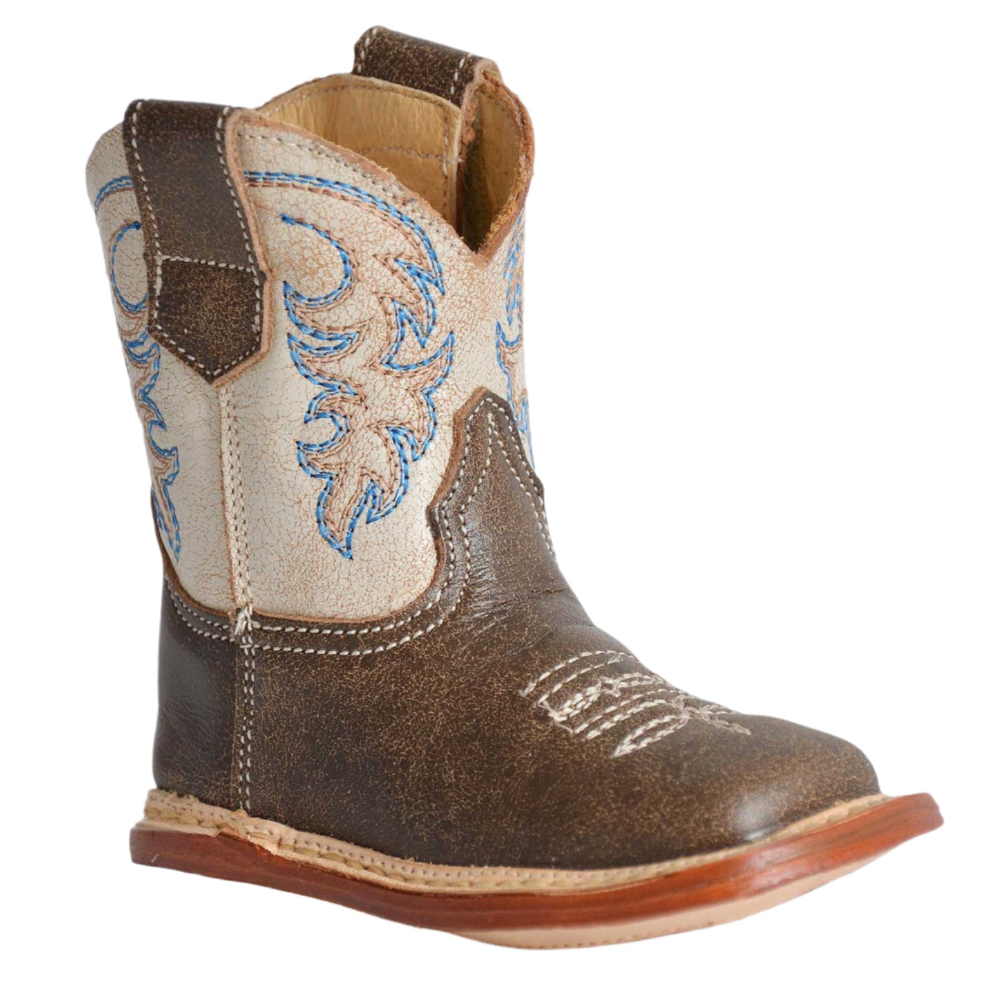Infant Boys Vintage Brown Leather Vamp With Creme Shaft: Get the best of both style and comfort with this pair of square toe shoes. The leather insole and lining provide plush cushioning, while the rubber inset sole adds durability and traction. The 3.5 inch shaft and velcro closure make for an easy and secure fit. Made with high-quality cowhide leather, these shoes are sure to impress. Don't miss out on adding these stylish and practical shoes to your little one's wardrobe!