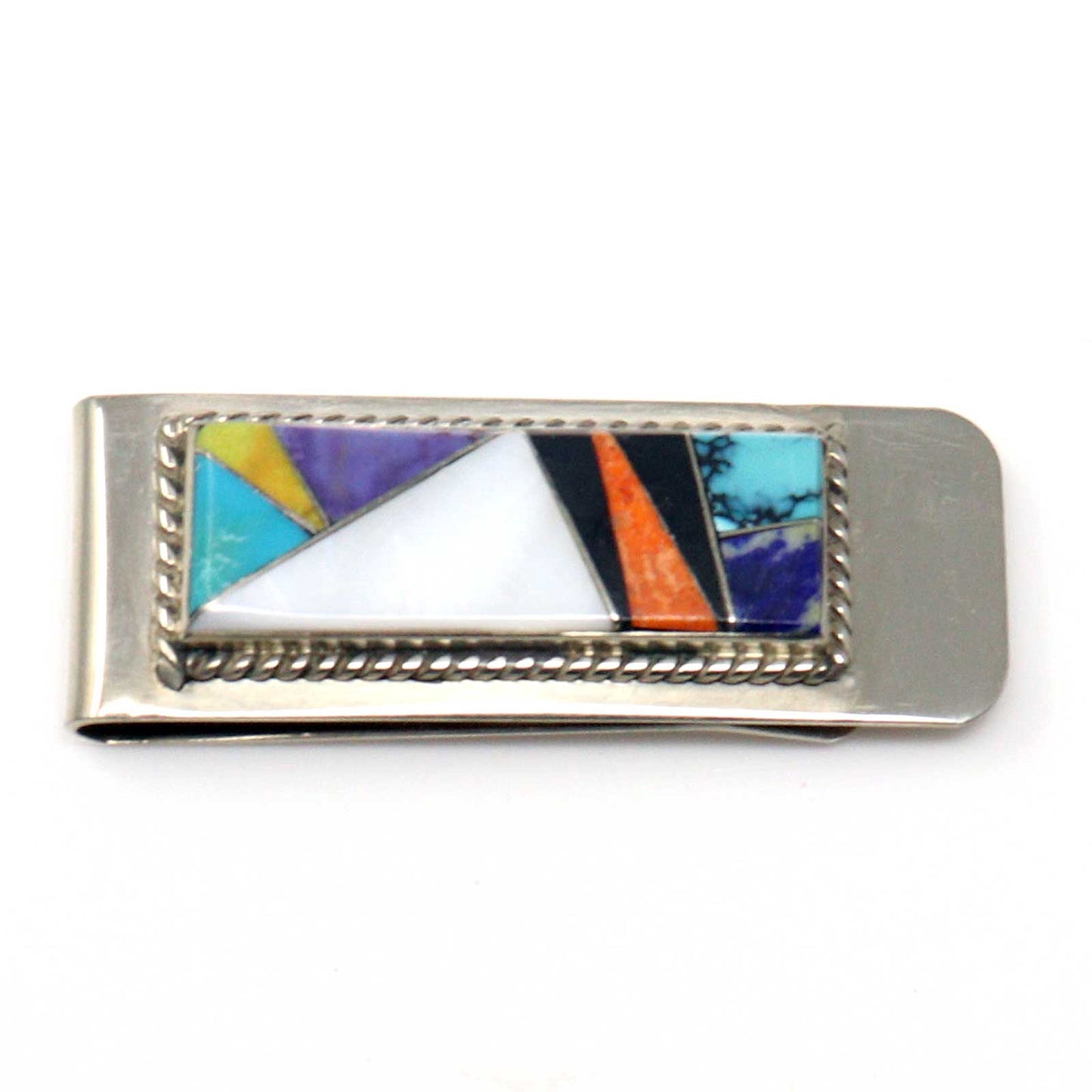 Turquoise inlayed money clip by Navaho artist Arnold Yazzie The money clip features a nickel finding with a sterling silver medallion featuring multi-stone inlay. Item dimensions are 2" x 3/4" - Medallion 1 1/2" x 5/8". Total weight is 19.5 grams which includes the nickel finding.