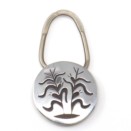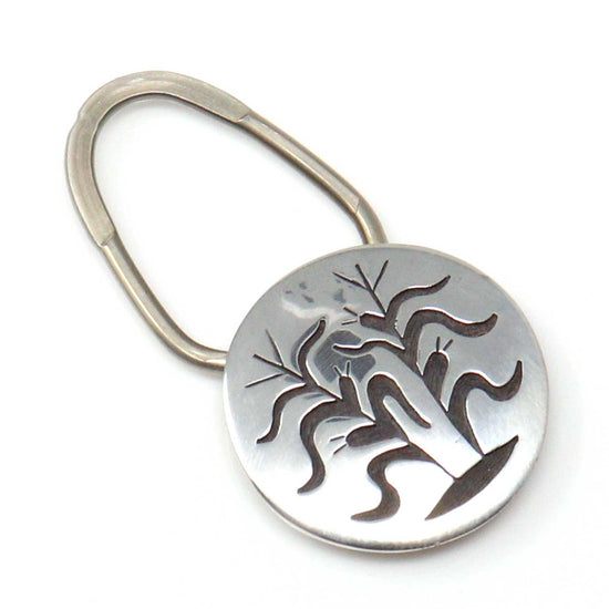 "Sterling silver Hopi overlay key ring featuring the bear paw design and clouds & rain design in the palm by Michael Sockyma.